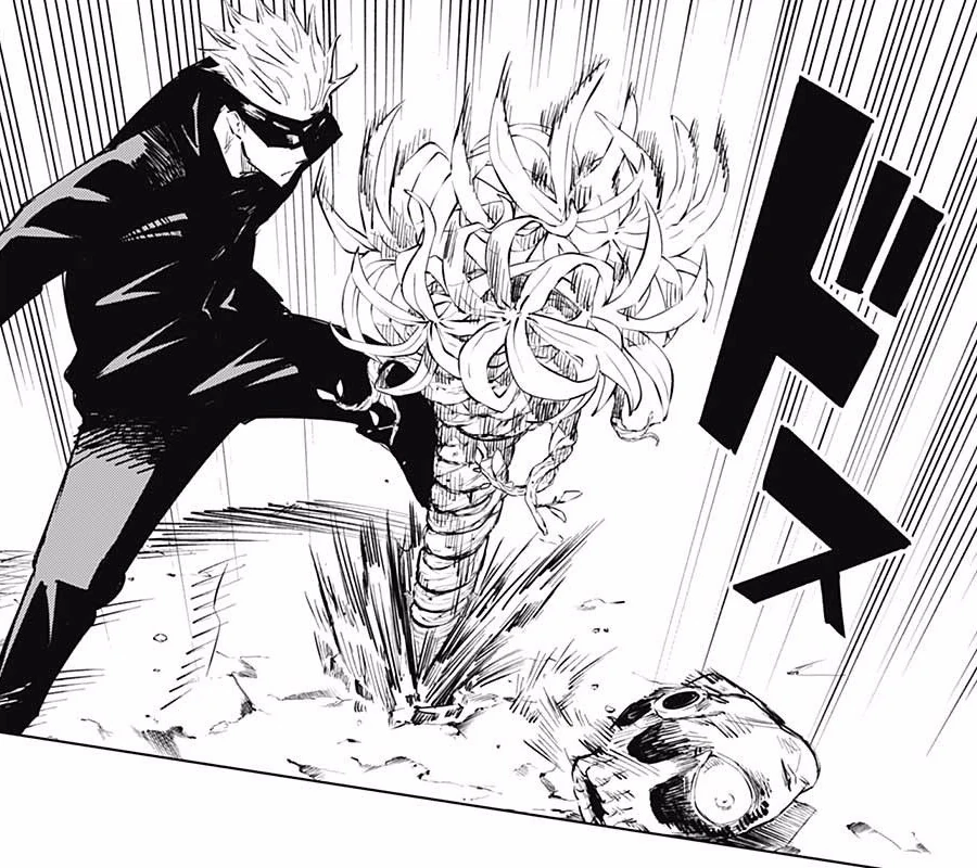Hanami lanza un ataque hacia sus oponentes. Un campo de flores se manifiesta, provocando que Gojo e Itadori, de a poco, pierdan los sentidos y sus poderes comiencen a debilitarse, sin embargo, ambos se percatan rápidamente de la situación. Lamentablemente, el efecto duro lo suficiente para lograr que ambas maldiciones lograr huir lejos de ellos. Gojo intenta seguirlos pero un monstruo de madera se manifiesta y atrapa a su alumno, aunque éste último diga que puede encargarse de la situación, se arrepiente en pocos segundos y su maestro se ve en la necesidad de ir y ayudar.