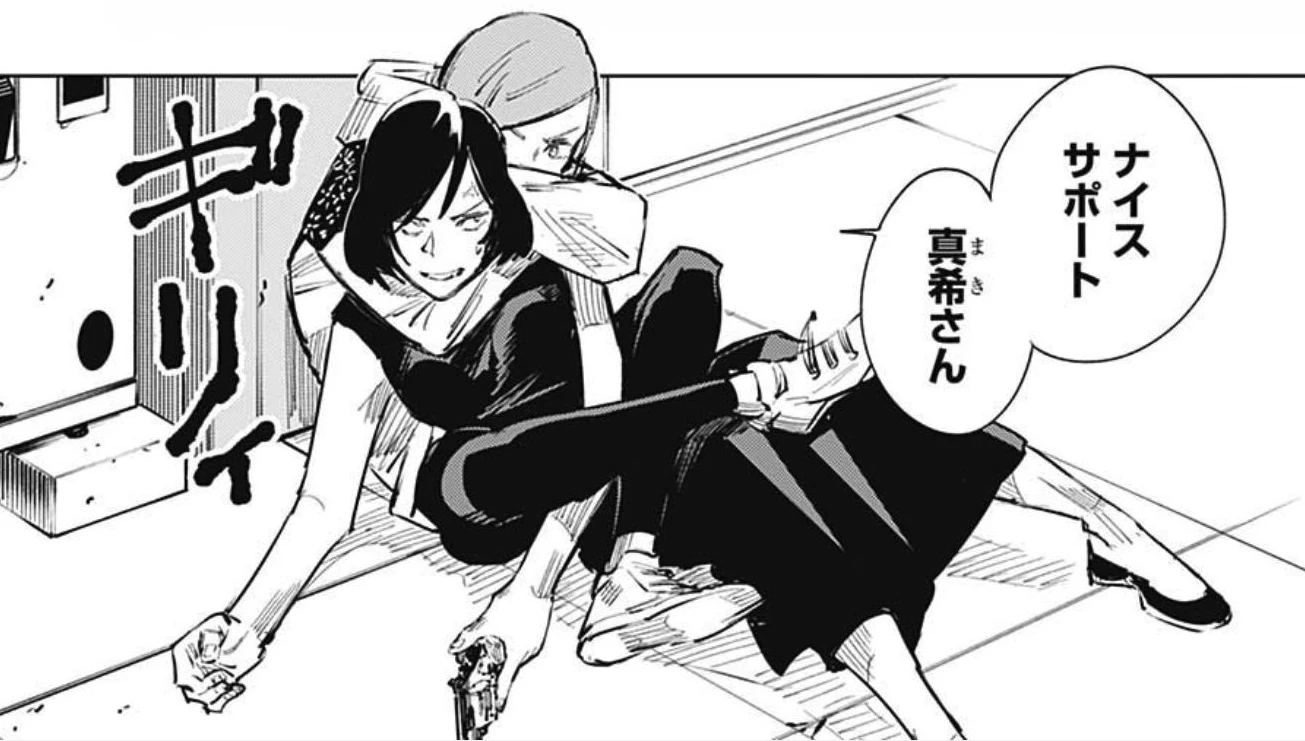 Ambas hermanas comienzan a discutir y a cuestionarse sus habilidades. Maki trata de inútil a su hermana porque sólo es capaz de cargar objetos imbuidos de energía maldita y no es capaz de hacer uso de alguna técnica. Mai se burla, asegurando que es mejor no tener una técnica que no tener energía maldita. Maki se rehúsa a seguir discutiendo y le pregunta a Nobara sí es capaz de levantarse.
