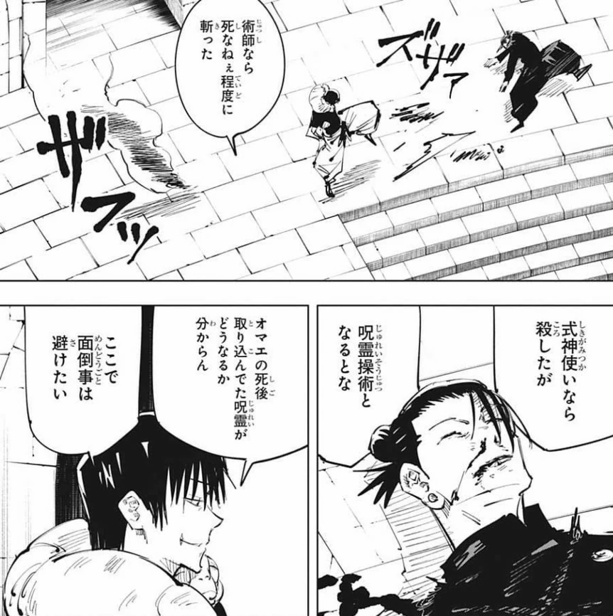Geto, molesto con todo lo sucedido, interrumpe a Fushiguro, exigiendo que deje de hablar sobre sus habilidades y explique el modo en que logró encontrar el camino hacía las Catacumbas Estelares. Fushiguro revela que no se guió por los remanentes de energía maldita, sino que hizo uso de sus cinco sentidos para rastrearlos. Tras dicha explicación, Geto desea saber el estado de Misato y éste responde que probablemente ella esté muerta.