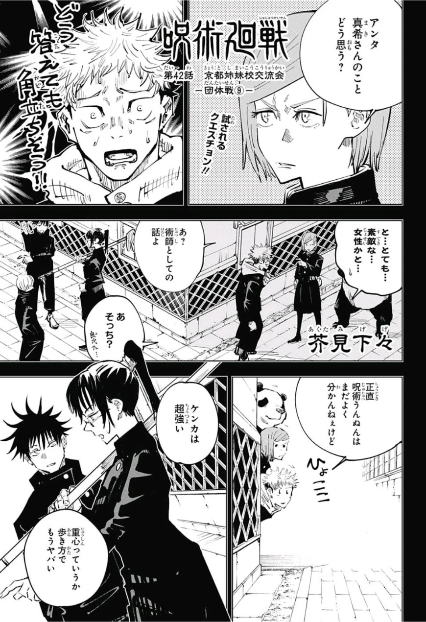 Festival de Intercambio de las Escuelas Hermanas - Batallas en Equipo, Parte 9 (京都姉妹校交流会 -団体戦⑨- Kyōto Shimai-kō Kōryū-kai -Dantai-sen ⑨-?) (lit. Reunión de Intercambio con Kioto - Batallas en Equipo, Parte 9) es el nombre del cuadragésimo segundo capítulo de la serie manga Jujutsu Kaisen, escrita e ilustrada por Gege Akutami.