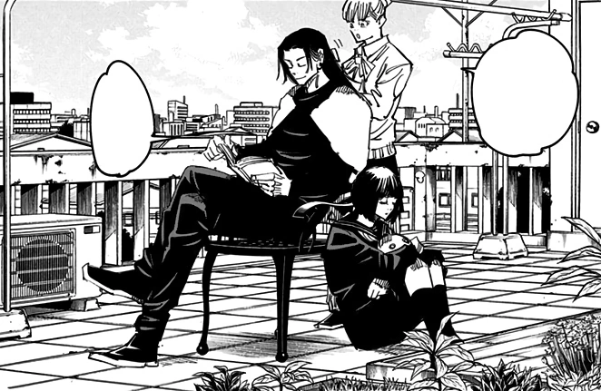Jogo looks over to see Mimiko and Nanako. They're alive but they didn't manage to escape the station completely. Jogo also notices their faces indicate they're afraid and surmises that they likely can't use another cursed technique to get out of harm's way. The cursed spirit is too focused on the curse users and doesn't even realize the hand holding Yuji's face has been cut off.