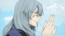As described by jujutsu sorcerers, Mahito is a human-looking cursed spirit with a patchwork face and gray eyes. (In the anime, Mahito possesses heterochromia, as his left eye is dark blue and his right eye is gray.) He has long grayish-blue hair that reaches past his neck and is sectioned off into three large strands with ties at the ends. Along with his face, Mahito has stitches all across his body that give him the appearance that he was sewn together.