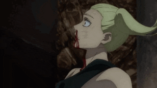 Angry at the sight of her hurting friend, Nobara rushes in behind Shigemo and prepares to swing her hammer. Shigemo's sword suddenly descends into his hand, confusing Nobara. She believed that the sword was out of play since he threw it away earlier. However, Shimgeo uses it to slice Nobara's lead leg, resulting in a shallow cut that halts her momentum. Before she can swing, Shigemo follows up by throwing the closed-fist end of the sword directly into Nobara's jaw.